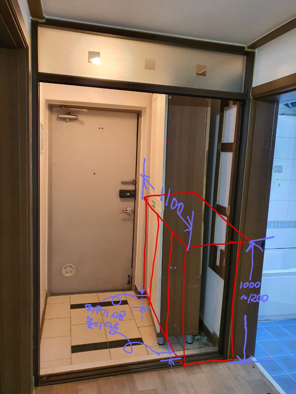 : 신발장을 설치할 바닥 왼편(타일)과 오른편(장판)의 높이가 다름.